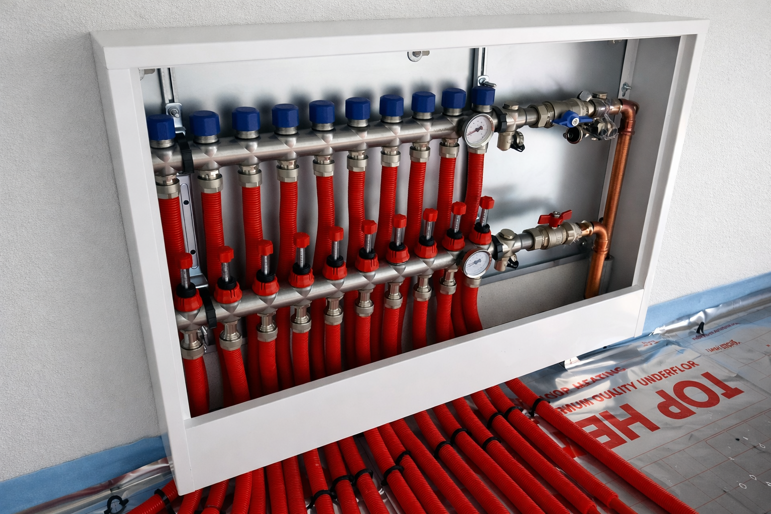 Kľúčovou časťou realizácie bola inštalácia podlahového kúrenia TOP HEATING, ktoré zabezpečuje tepelnú pohodu aj v otvorených obytných zónach s galériou. Systém sme nastavili tak, aby prinášal rovnomerný prenos tepla, stabilnú prevádzku a vysoký komfort bez studených miest.